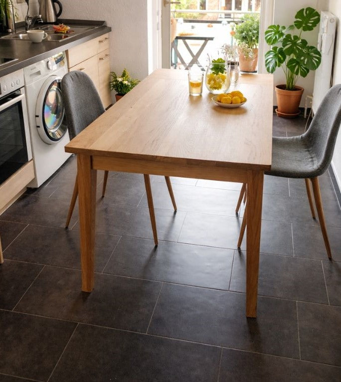 Mit einer Versiegelung aus hochwertigem Hartwachsöl bleibt dein Tisch auch bei täglichen Abenteuern strahlend schön. Mit unserem genialen Pflegesystem - Made in Germany - kannst du deinen Tisch ein Leben lang auffrischen – so mühelos wie ein bisschen Lippenstift nachziehen. Egal, ob für die große Party oder das gemütliche Dinner, dein Tisch ist immer bereit und sieht dabei fantastisch aus.