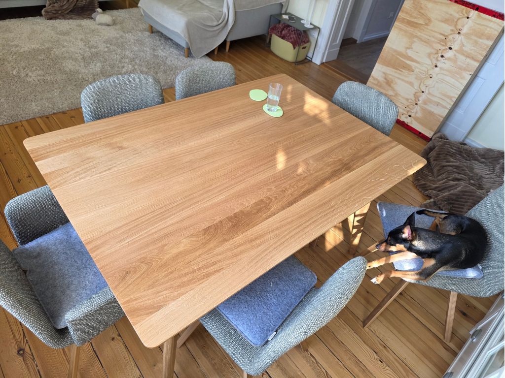 Mit einer Versiegelung aus hochwertigem Hartwachsöl bleibt dein Tisch auch bei täglichen Abenteuern strahlend schön. Mit unserem genialen Pflegesystem - Made in Germany - kannst du deinen Tisch ein Leben lang auffrischen – so mühelos wie ein bisschen Lippenstift nachziehen. Egal, ob für die große Party oder das gemütliche Dinner, dein Tisch ist immer bereit und sieht dabei fantastisch aus.